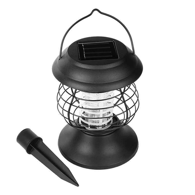 Przenośna lampa solarna LED, z dwoma diodami LED, 1x klasyczna biała do dekoracyjnego oświetlenia i 1x UV fioletowa LED do likwidacji komarów.